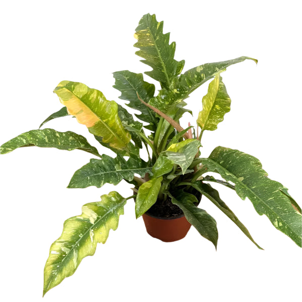 The Philodendron Ring of Fire is a rare and highly coveted plant known for its stunning variegated foliage, which displays a fiery mix of colors including green, red, orange, yellow, and cream. Each leaf has a serrated, jagged edge that adds to the plant's dramatic appearance. Compact and slow-growing, this tropical beauty is perfect for collectors and plant enthusiasts looking to add something truly unique to their collection. Its constantly changing leaf colors make it an exciting addition to any indoor plant display.